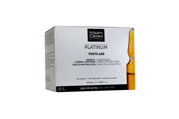 Photo-age ampollas previene el fotoenvejecimiento y repara la piel tras la exposición solar. Contiene 3% de proteoglicanos Proteum 89+ de origen vegetal y de última generación, hidratantes y reafirmantes para mejorar la estructura y elasticidad de la piel. Contiene un 15% de vitamina C pura, antioxidante potente, para ayudar a la producción de colágeno y con acción despigmentante. La vitamina C, además, aporta luminosidad y protege frente a los radicales libres, efecto antipolución.